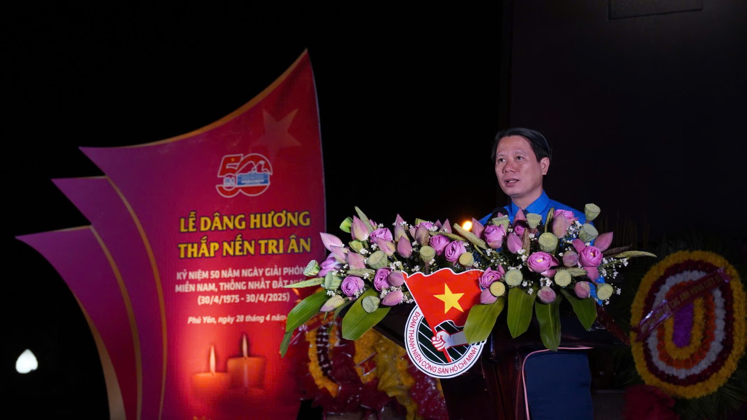 Tối ngày 28/4, Tỉnh Đoàn Phú Yên long trọng tổ chức Lễ dâng hương, thắp nến tri ân các anh hùng liệt sĩ nhân kỷ niệm 50 năm Ngày Giải phóng miền Nam, thống nhất đất nước (30/4/1975-30/4/2025). Các đồng chí Ủy viên Ban Thường vụ Tỉnh ủy: Trần Hữu Thế, Chủ tịch Ủy ban MTTQ tỉnh; Đào Bảo Minh, Trưởng Ban Nội chính Tỉnh ủy; Đinh Thị Thu Thanh, Trưởng Ban Tuyên giáo và Dân vận Tỉnh ủy; Bùi Thanh Toàn, Bí thư Thành ủy Tuy Hòa; lãnh đạo các sở, ngành cùng đông đảo đoàn viên, thanh niên, người dân tham dự.