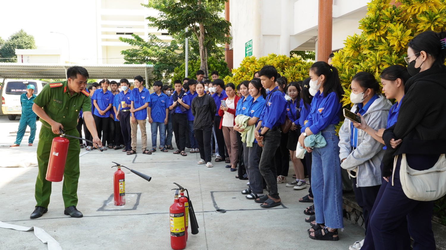 Thực hành, hướng dẫn việc sử dụng bình chữa cháy và một số thiết bị chữa cháy cho đoàn viên, thanh niên.