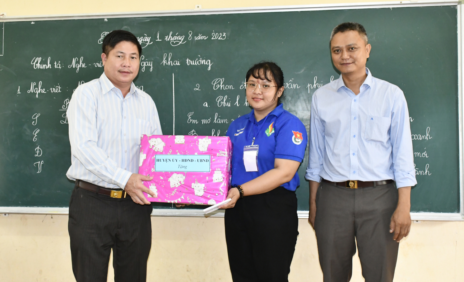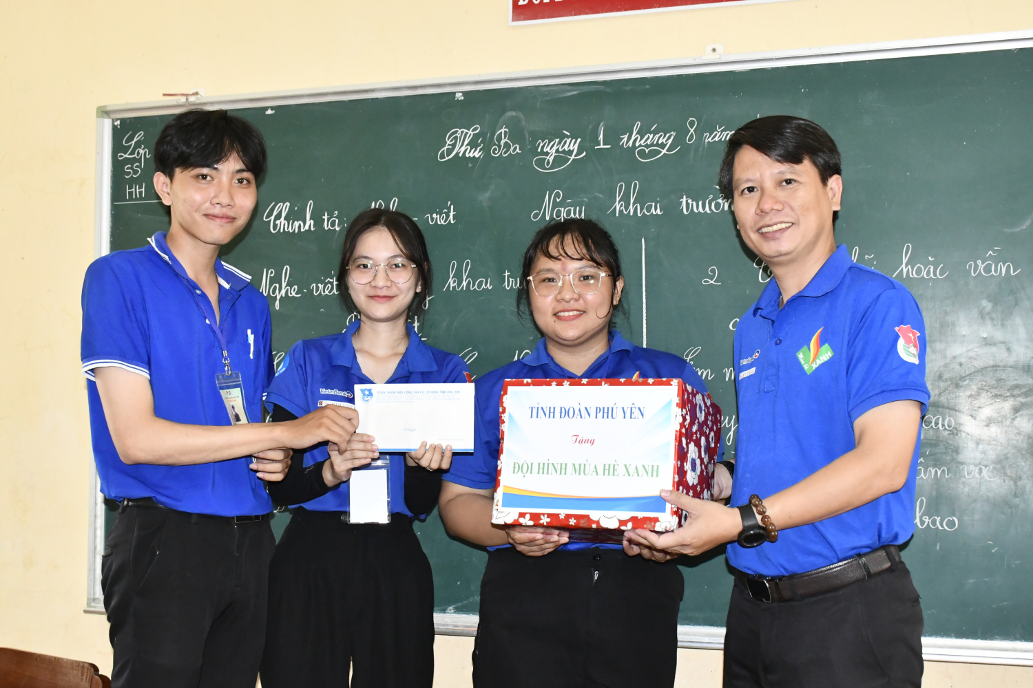 Bí thư Tỉnh Đoàn, Chủ tịch Hội LHTN Việt Nam tỉnh Lương Minh Tùng tặng quà động viên các chiến sĩ tình nguyện Mùa hè xanh của Trường đại học Phú Yên.
