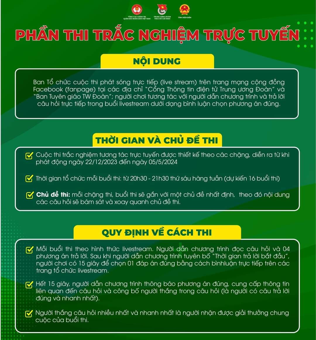 Hình thức thi trắc nghiệm tương tác trực tuyến dự kiến có 16 buổi thi tổ chức vào tối thứ Sáu hàng tuần, bắt đầu từ 18/12/2023 đến 05/5/2024. Các buổi thi được phát sóng trực tiếp (live stream) trên trang các fanpage: Cổng thông tin điện tử Trung ương Đoàn, Ban Tuyên giáo TW Đoàn, Hội Liên hiệp thanh niên Việt Nam, Hội sinh viên Việt Nam. Người chơi tương tác với người dẫn chương trình và trả lời câu hỏi trực tiếp trong buổi livestream dưới dạng bình luận chọn phương án đúng.