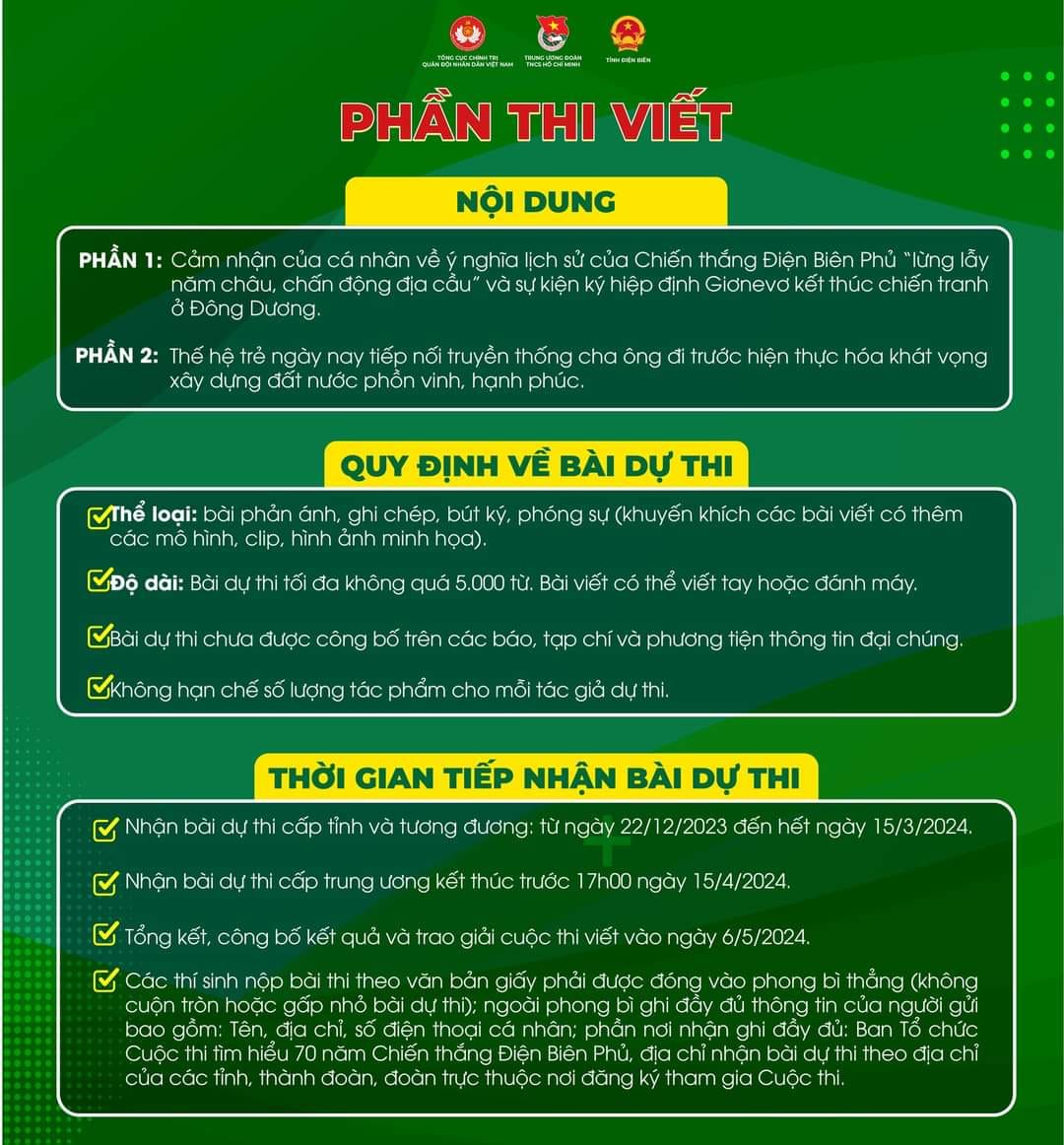 Với hình thức thi viết, thời gian bắt đầu từ ngày 18/12/2023 đến hết ngày 15/4/2024. Bài dự thi là bài phản ánh, ghi chép, bút ký, phóng sự độ dài không quá 5.000 từ gồm 02 phần: Cảm nhận của cá nhân về ý nghĩa lịch sử của Chiến thắng Điện Biên Phủ và sự kiện ký hiệp định Giơ ne-vơ kết thúc chiến tranh ở Đông Dương; Thế hệ trẻ ngày nay tiếp nối truyền thống cha ông đi trước hiện  thực hóa khát vọng xây dựng đất nước phồn vinh, hạnh phúc.
