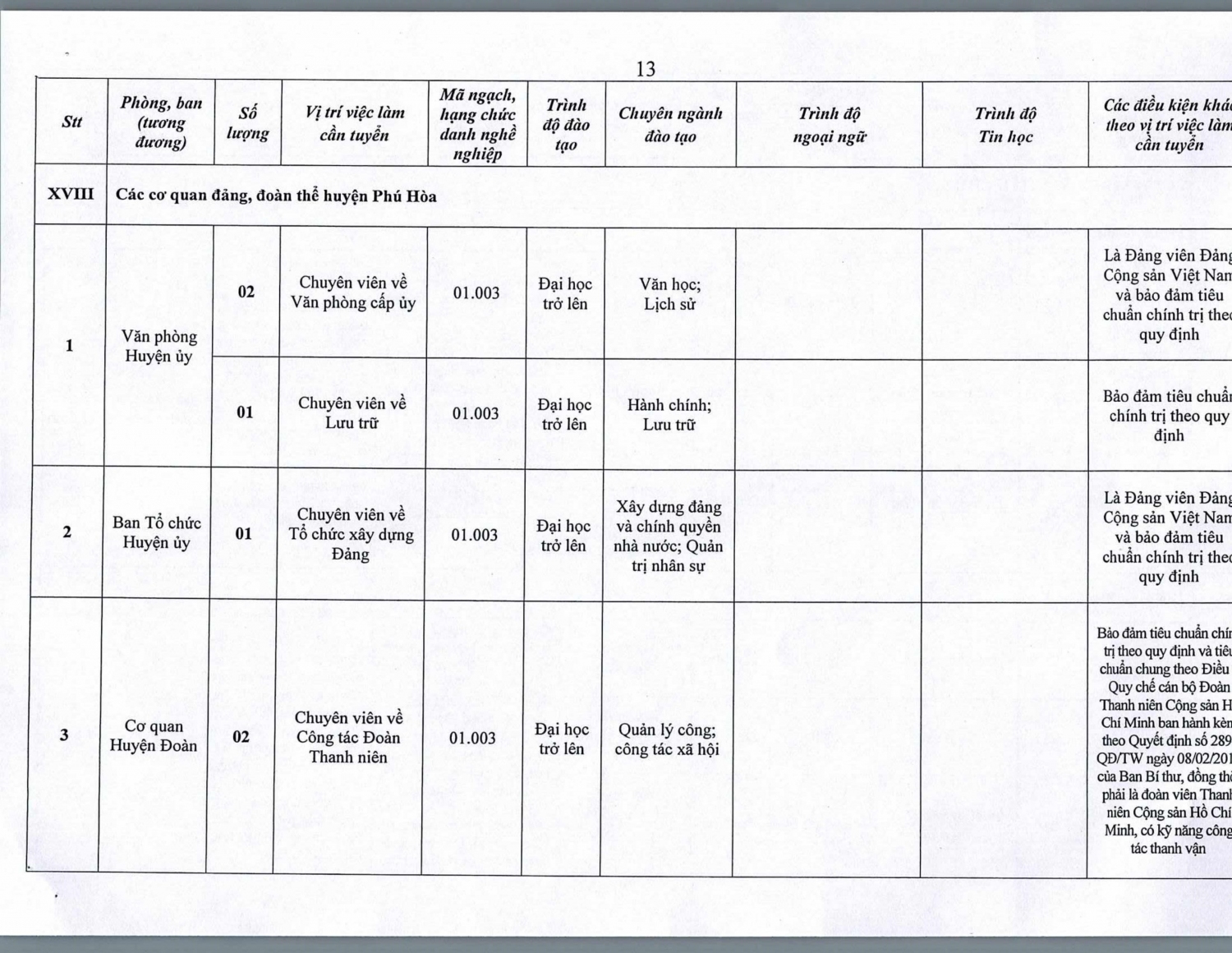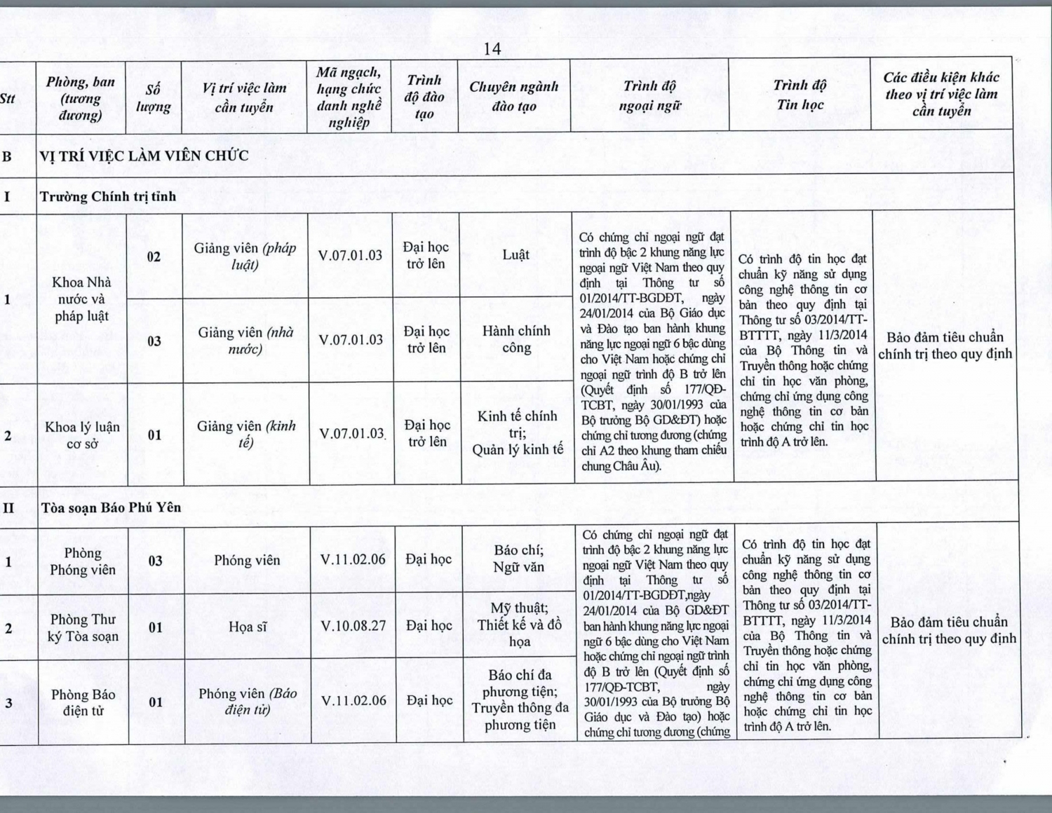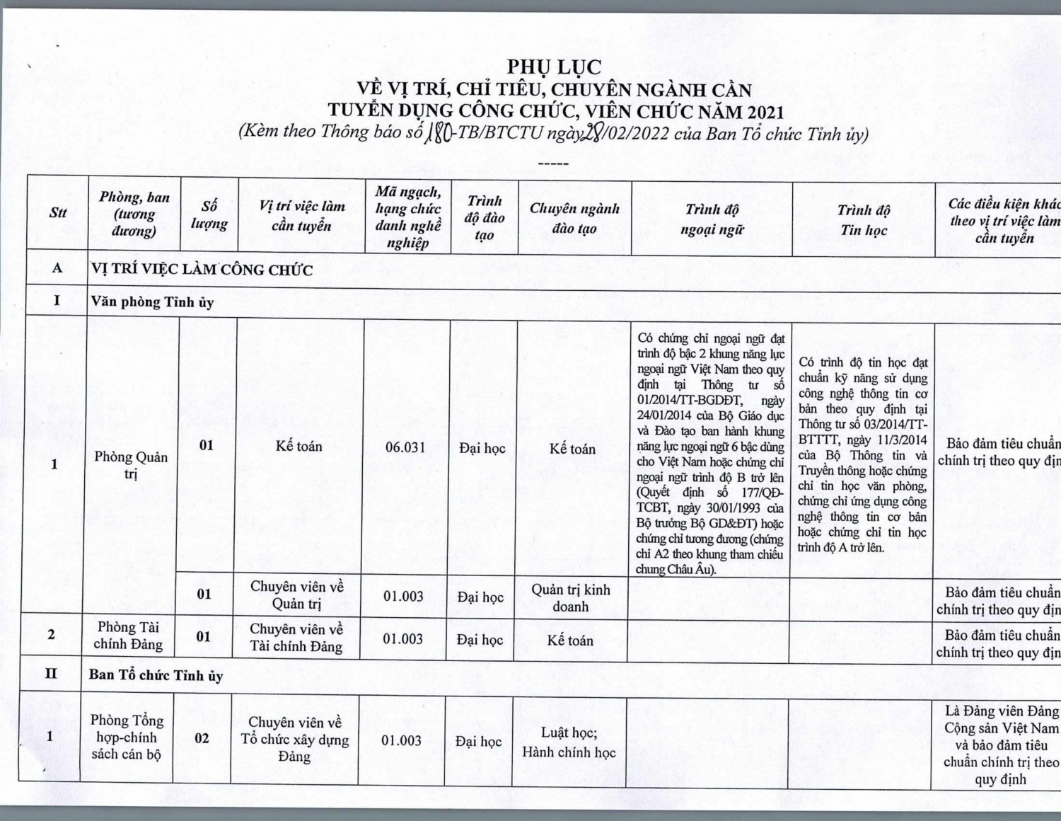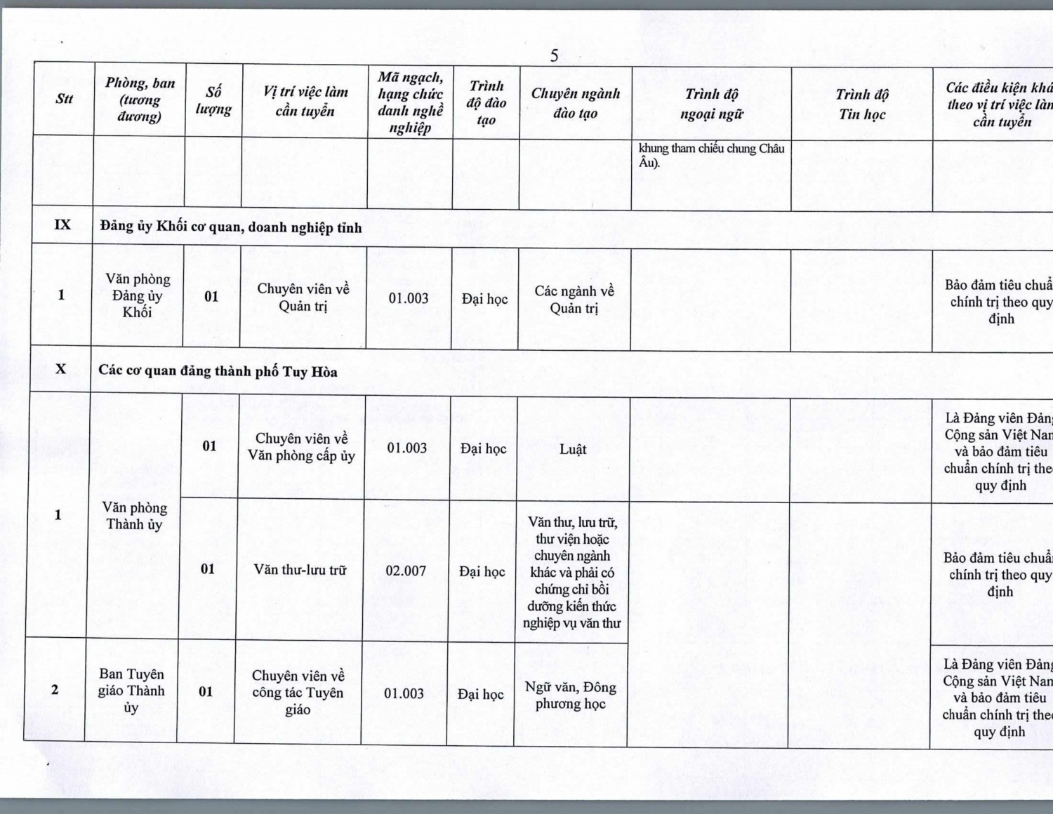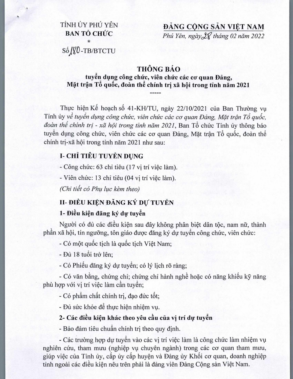 Ban Tổ chức Tỉnh ủy Phú Yên thông báo tuyển dụng công chức, viên chức các cơ quan Đảng, Mặt trận Tổ quốc, đoàn thể chính trị xã hội trong tỉnh 2021, cụ thể như sau: