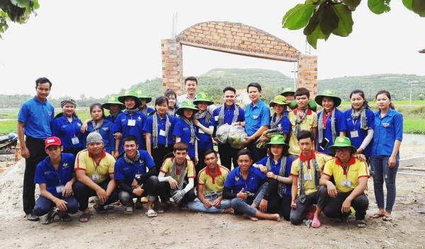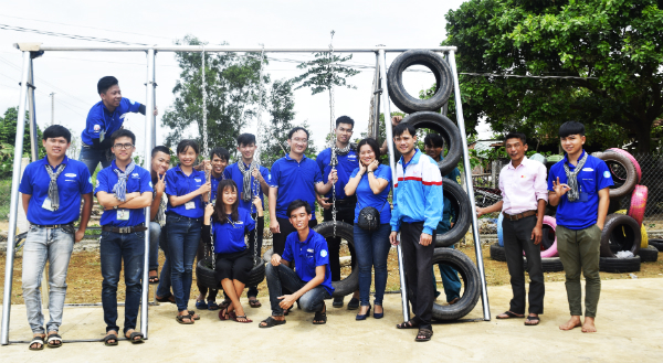 Chụp hình lưu niệm tại công trình thanh niên "Khu vui chơi cho các em thiếu nhi" của đội hình tình nguyện Trường Đại học Sư phạm Kỹ thuật TP. Hồ Chí Minh.